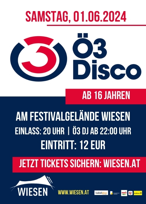 Ö3 - Disco Wiesen - Das heißt gute Laune und Sommerfeeling am Festivalgelände Wiesen! Super Stimmung, heißer Sound und eine geniale Party erwarten Euch bei der Ö3-Disco! Feiert mit uns den Sommer und macht dieses Event zu Eurer Party! Der Ö3 DJ mixt für Euch die besten Hits! Kühle Getränke und Cocktails sorgen für gute Abkühlung!